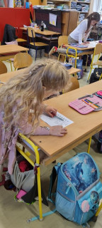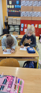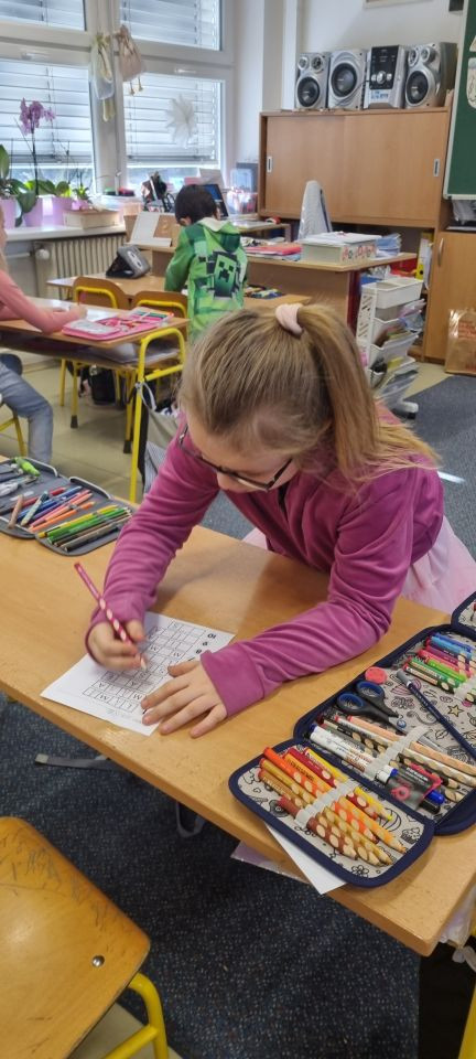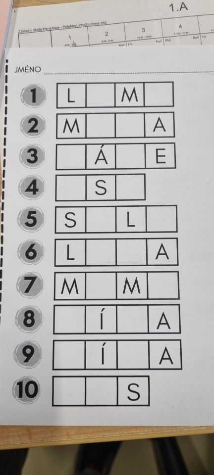 I při ČJ lze trochu sportovat. V pátek jsme si opakovali slabiky a jednoduchá slova pomocí "běhačky". Naším úkolem bylo přečíst postupně všechna slova, zapamatovat si přečtená písmena a do karty, kterou jsme měli ve třídě na lavici, správně doplnit písmenka. Toto učení se nám moc líbilo a zvládli jsme to všichni perfektně.