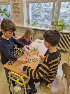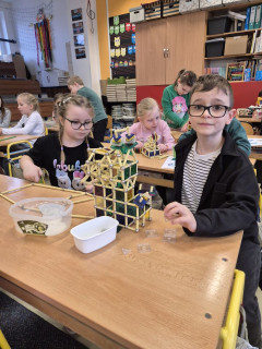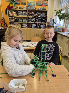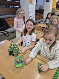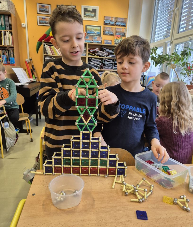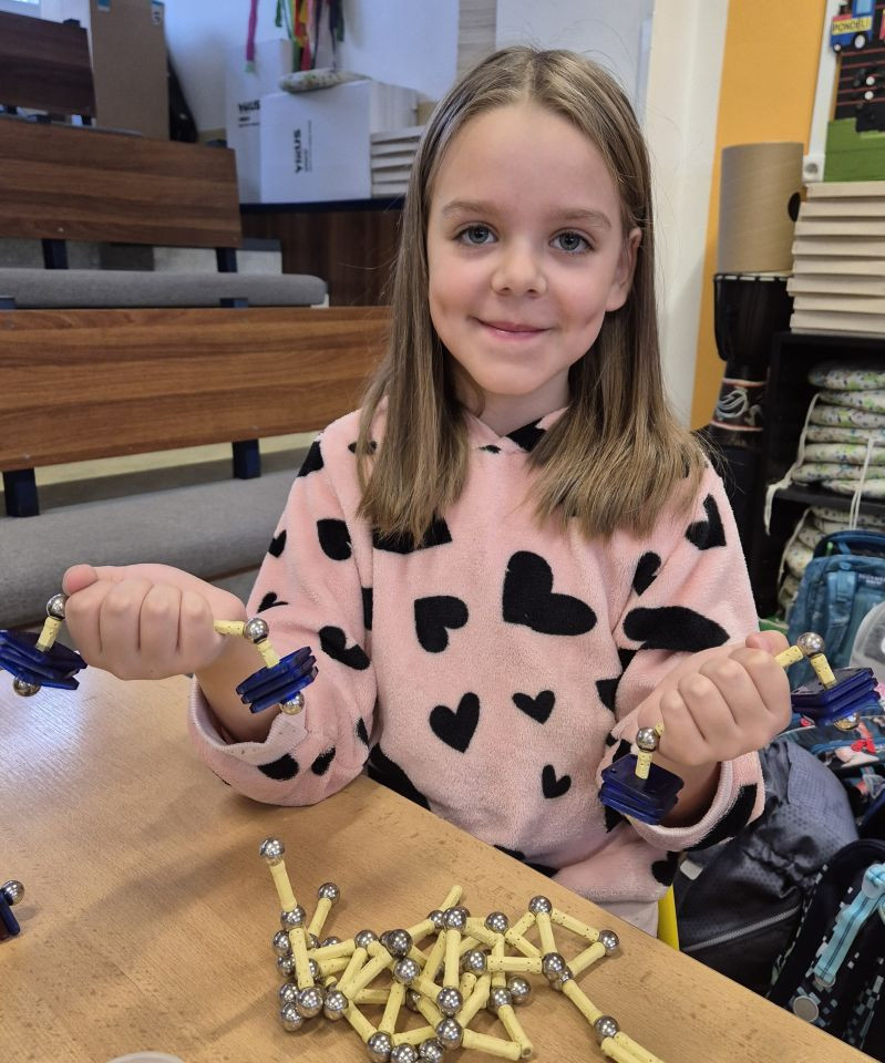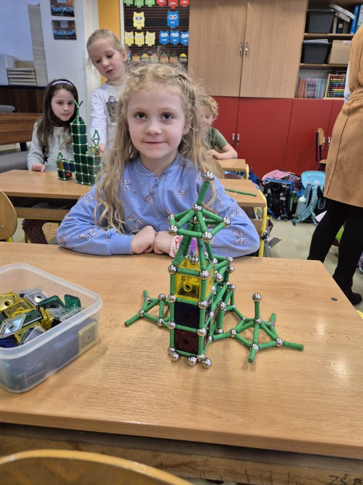Dnešní část dopoledne jsme strávili se stavebnicí GEOMAG a tak jsme si v praxi mohli vyzkoušet stavby geometrických těles o kterých si povídáme v matematice, ale také jsme popustili uzdu své fantazie a zkusili postavit rozličné a různě velké stavby. Práce se stavebnicí nás moc bavila a hravě jsme si tak zopakovali učivo geometrie.