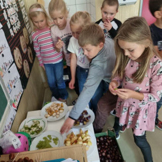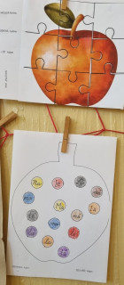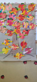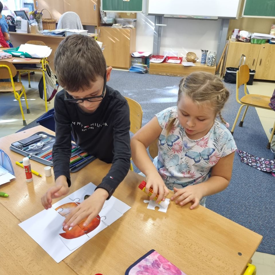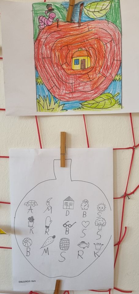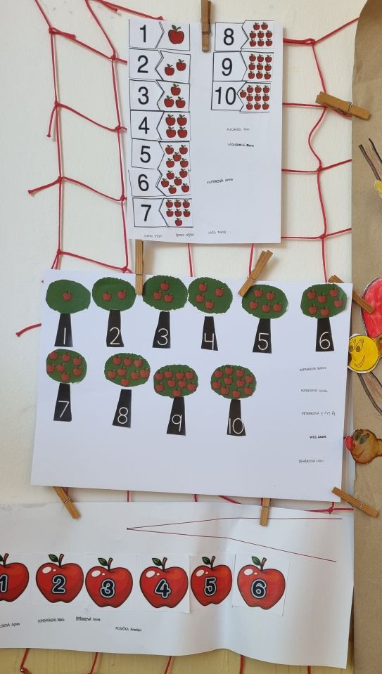 V Centru Matematiky jsme společně sestavovali čísla , přikládali správný počet jablíček k číslům, seřadili stromy v sadu podle počtu jablek a také jsme řadili jablíčka s nejmenší hodnotou po nejvyšší. V Českém jazyce naše spolupráce spočívala v sestavování dvojic písmen a slabik, sestavení jablíčkového puzzle, našli jsme cestu červíka Pepíka do jeho domku a také jsme psali správná počáteční písmena k obrázkům, což byl pro nás hodně těžký úkol, spoustu písmenek ještě neznáme. Protože jsme ale pracovali ve skupině, pomáhali jsme si. U Pokusů a objevů jsme zkoušeli nové chutě podzimního ovoce, zkoumali jádřinec, porovnávali jablko zdravé a červivé ,seznámili jsme se pomocí pohádky "O jabloňce" s fázemi růstu jabloně. V ateliéru jsme jablka zavařovali do sklenic a také jsme vytvořili společný strom plný jablíček.