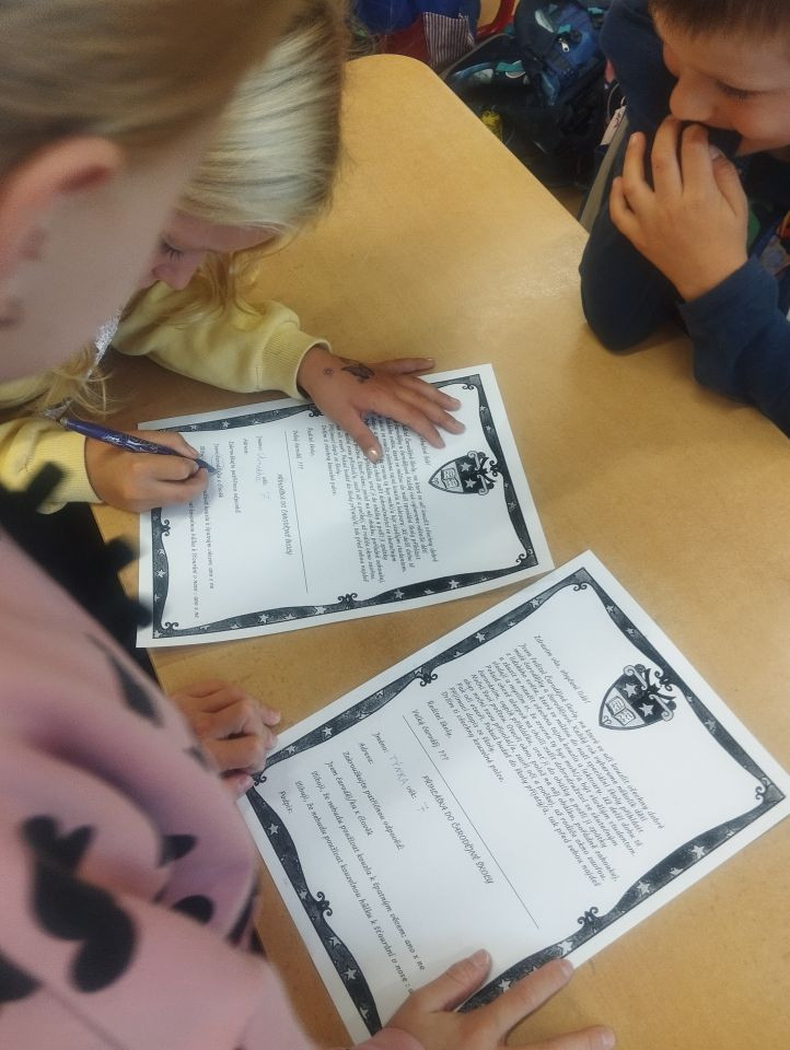 Nakonec se nám podařilo zvládnout všechny zkoušky na jedničku a čekalo nás úplně poslední, nejsilnější kouzlo, které zároveň odebralo magickou moc našim hůlkám. Posledním kouzlem jsme si přičarovali odměnu za naše skvělé výsledky a vzácný Diplom z Čarodějné školy, který z nás již navždy dělá přátele úplně všech čarodějnic, čarodějů, kouzelnic i mágů.