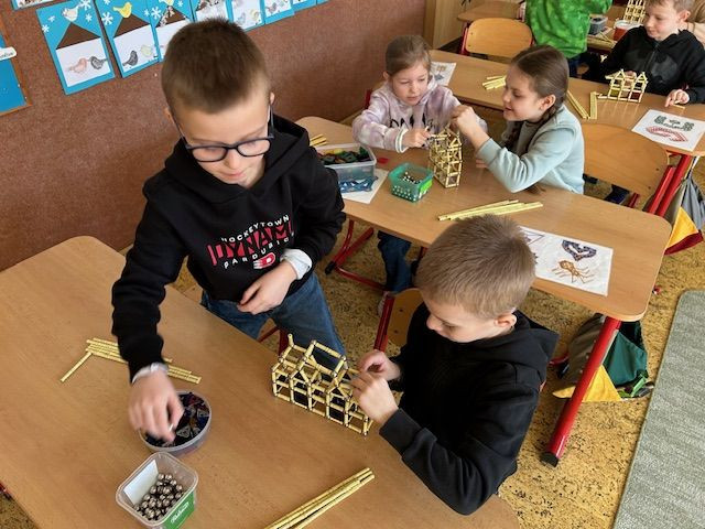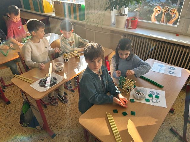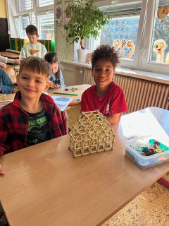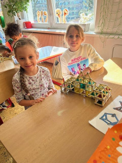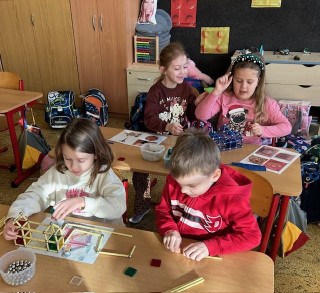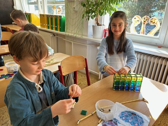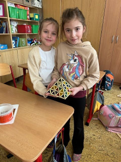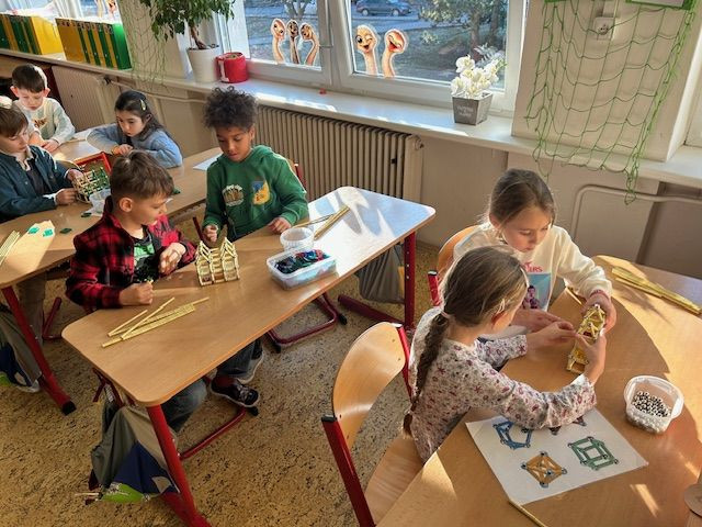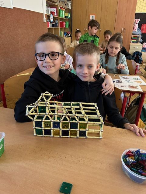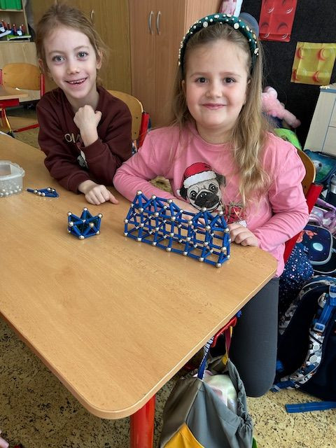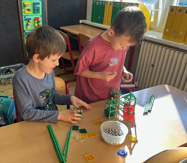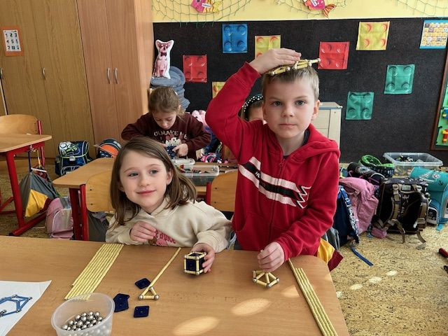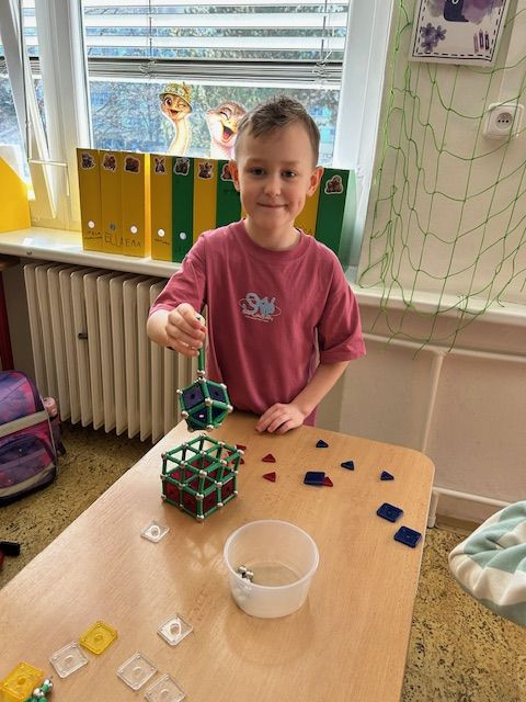 V matematice se seznamujeme s geometrickými tělesy a k tomu nám i výborně posloužila stavebnice Geomag. Tato magnetická stavebnice umožňuje dětem zábavnou formou vyzkoušet prostorovou představivost i spolupráci. Důležitá byla také trpělivost a plánování. Vznikaly zajímavé stavby připomínající domy, věže, mosty. Každý měl možnost projevit i vlastní fantazii a práce děti moc bavila.
