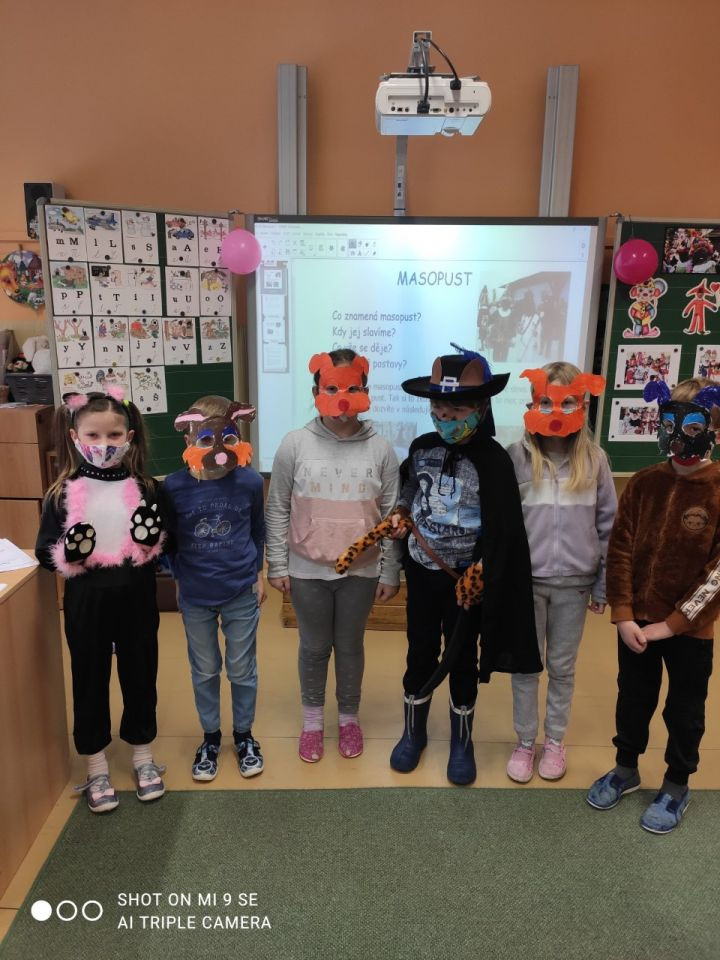 Tento týden proběhl nejen v naší třídě Masopust. Děti se ustrojily za různé masky. Ve třídě se objevili Spidermani, kočička a pejskové, Smrtka, čarodějové a kouzelníci, upír, Indián, Kocour v botách, Sněhurka, pirát, víly .... Vysvětlili jsme si, proč a kdy se Masopust slaví. Děti plnily různé úkoly z českého jazyka i matematiky. Ve výtvarné výchově "napekly" výborné masopustní koláče. Také jsme si zasoutěžili. Pochutnali jsme si na masopustní bábovce a masopustních muffinách, které nám poslaly maminky. Moc děkujeme!!! Všechny děti si nakonec odnesly malou odměnu. Karnevalový rej pak pokračoval odpoledne i ve školní družině. Den jsme si užili!