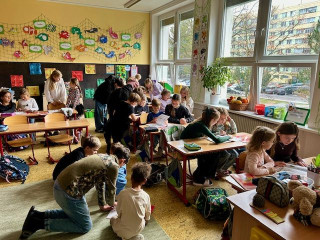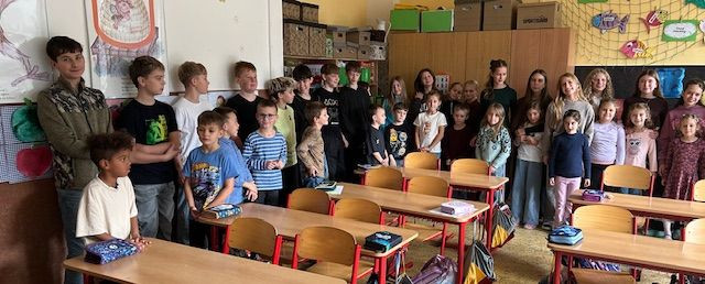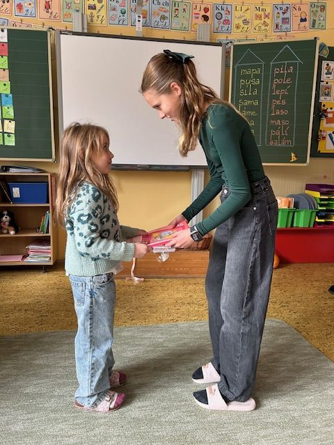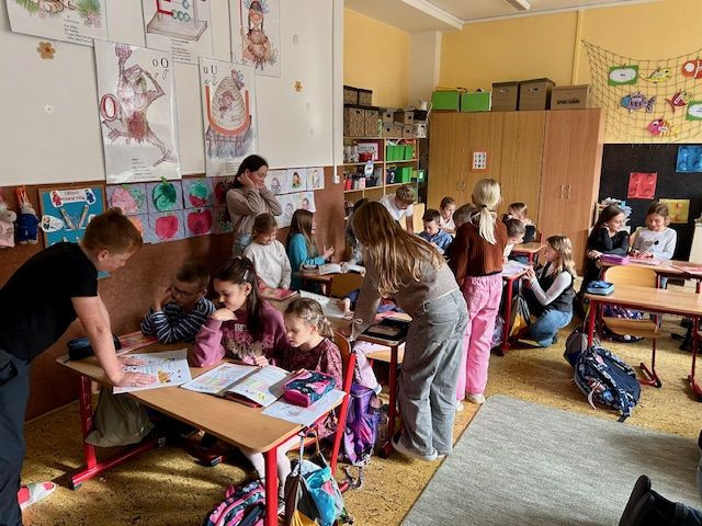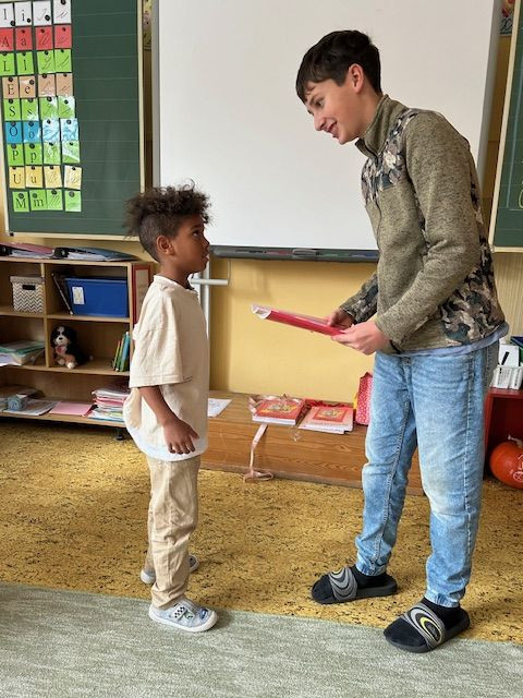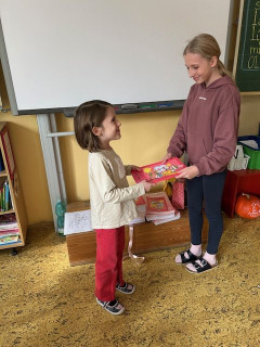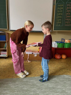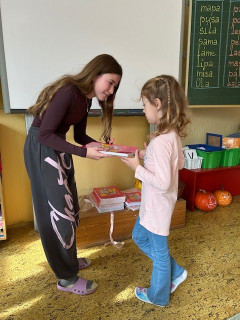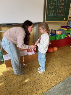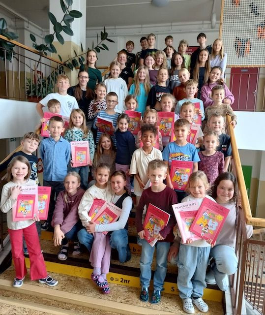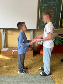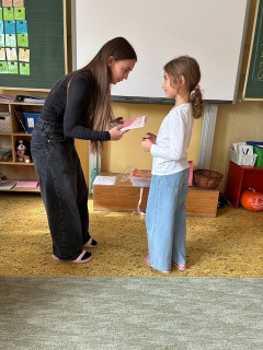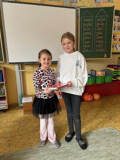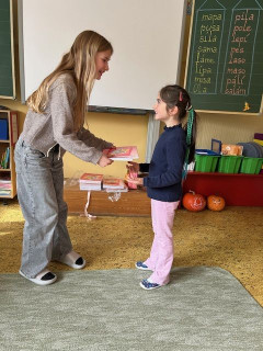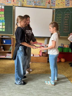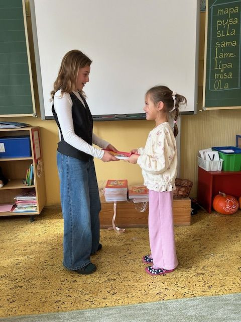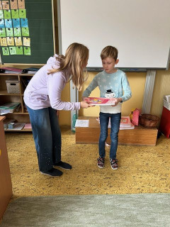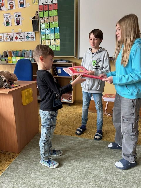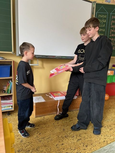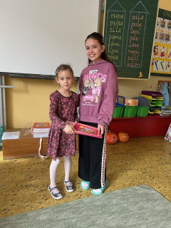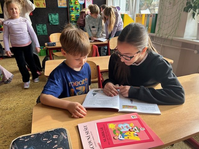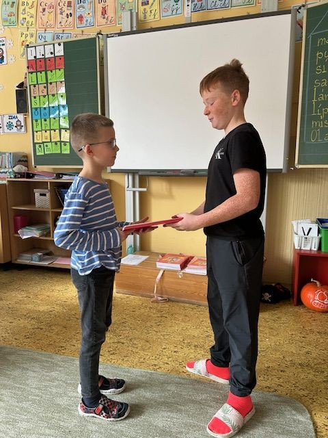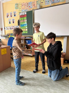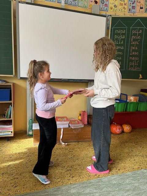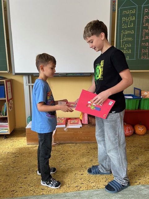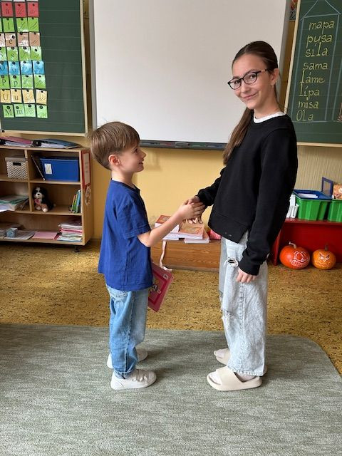 Tento výjimečný den pro prvňáčky připravili jejich starší patroni ze 6.B. Prvňáčci nejprve přečtli první slova a věty . Šesťáci jim pak na oplátku předali jejich první Slabikář a přečetli jim z něj pár úryvků. Ve třídě byla moc příjemná atmosféra a nebylo to jen o knihách, ale také o novém přátelství mezi prvňáčky a šesťáky. Slíbili si, že se budou potkávat při dalších aktivitách.