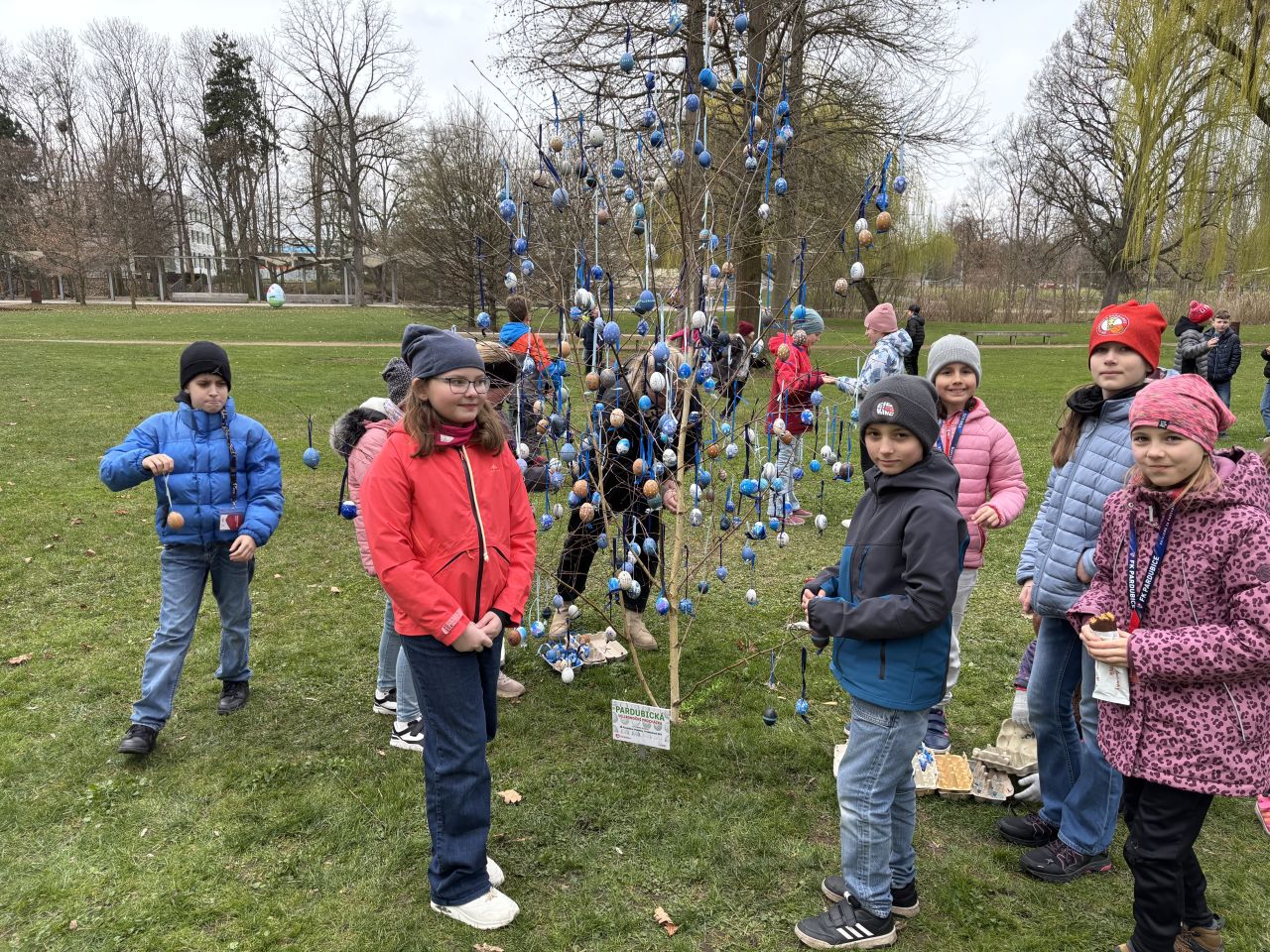 Již tradičně se naše školní družina podílela na výzdobě města. Děti ze školní družiny spolu s p. vychovatelkami nazdobily velikonoční kraslice do jemných modrobílých odstínů. Na dekorace použily mnoho technik (malbu voskem, inkoust se zmizíkem, temperové barvy, třpytky, korálky i lak na nehty). Bylo nám ctí, že jsme se čtvrťáky mohli pomoci s navěšením těchto krásně nazdobených kraslic na stromek v Tyršových sadech.
