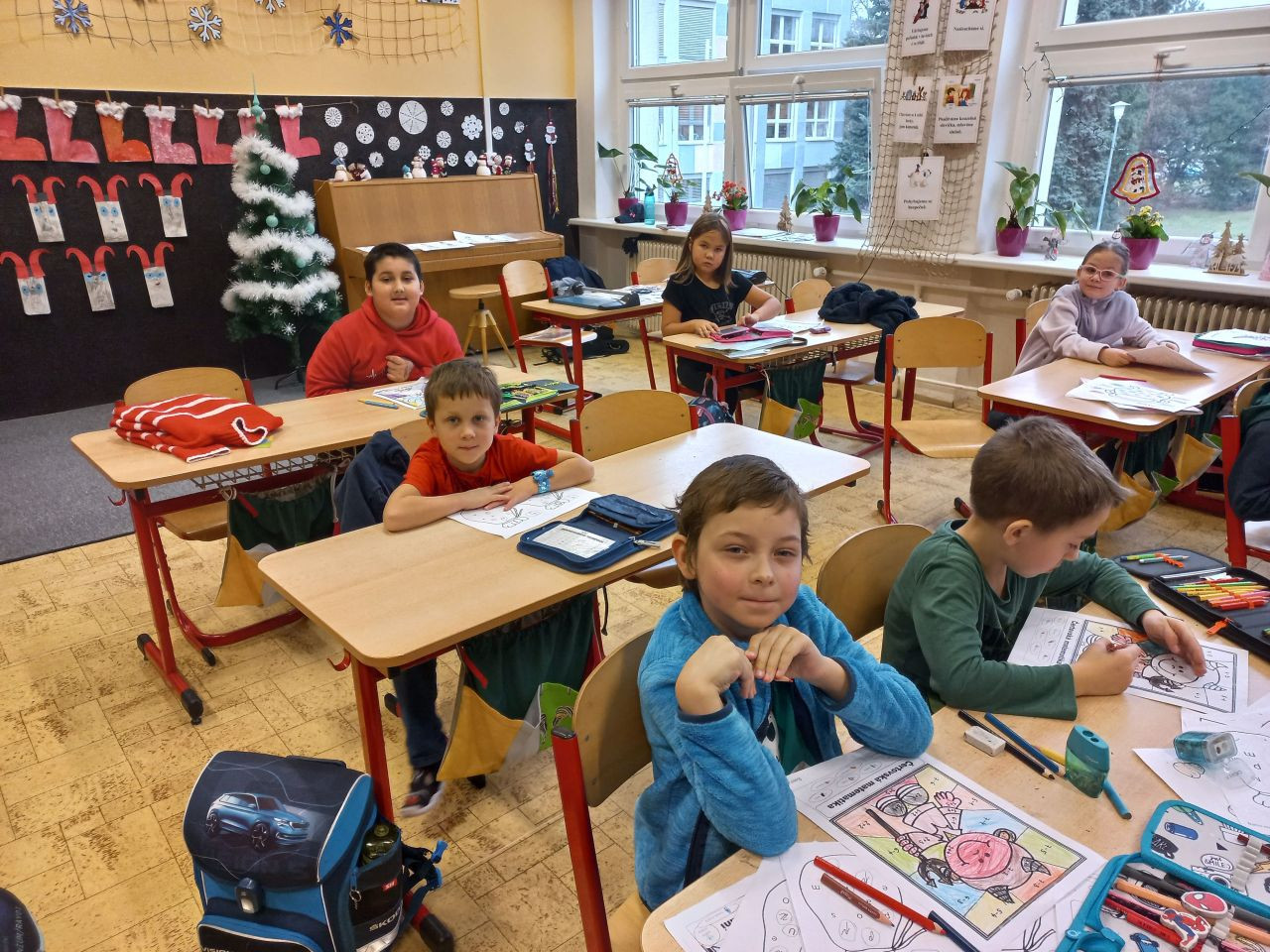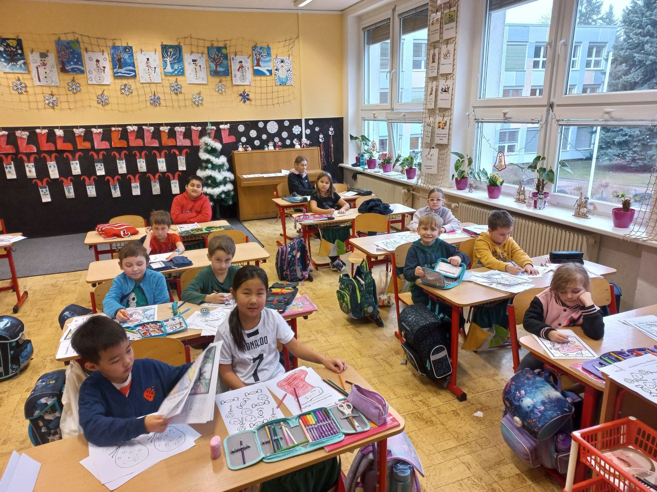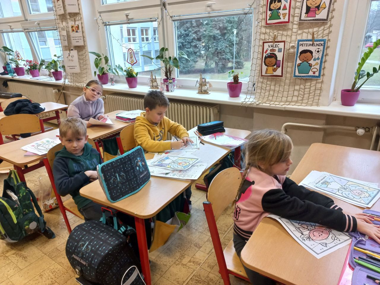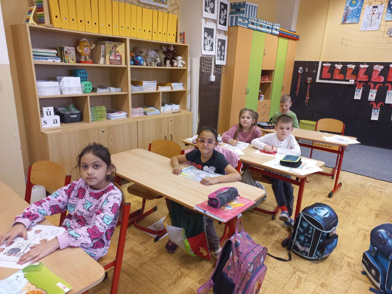 V hodinách českého jazyka a matematiky žáčci vypracovali pracovní listy k těmto tématům zaměřené na opakování a procvičování učiva. Součástí vypracování bylo vybarvování, stříhání a lepení. V oddechovém čase nechybělo několik pohádek, které žáčci zhlédli.