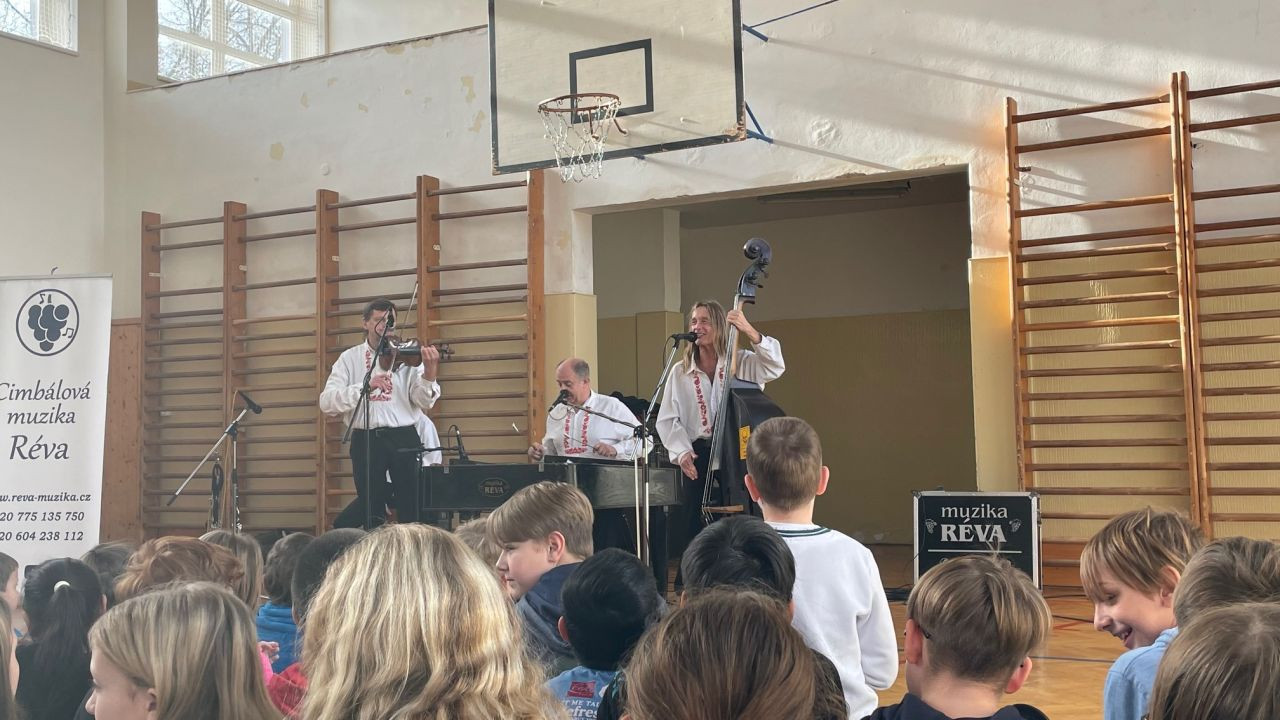 V pátek jsme ve školní tělocvičně zavítali na koncert cimbálovky. Poslechli jsme si hudbu nejrůznějších žánrů a nakonec jsme si zazpívali i zatančili.