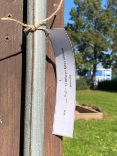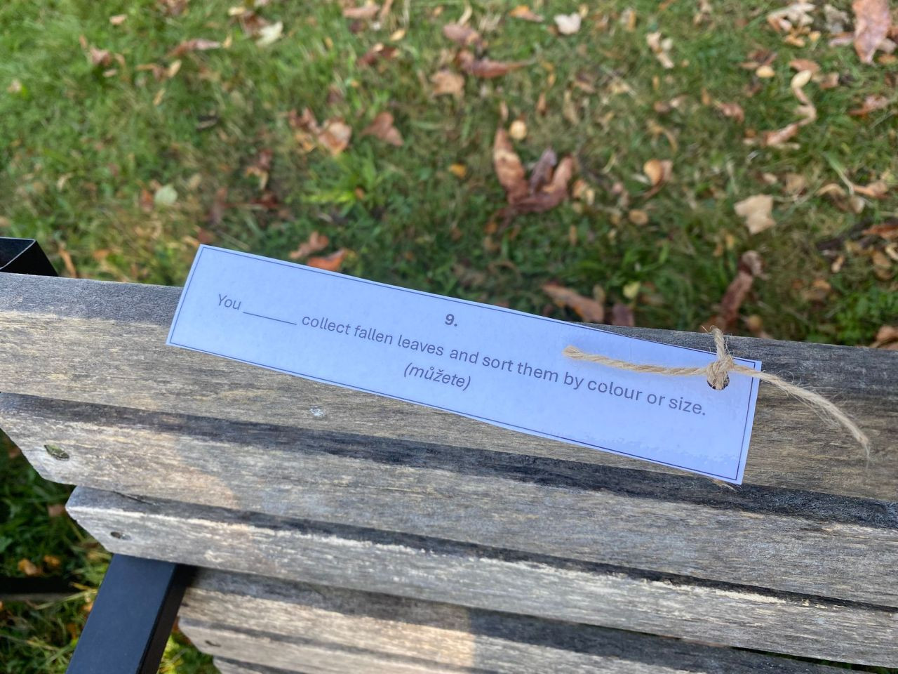 Žáci měli na školní zahradě rozvěšené úkoly při kterých si zopakovali používání způsobových sloves (moci, umět, muset, nemuset, nesmět, doporučení co se dělá, co ne apod.).